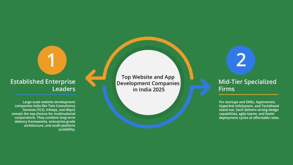 Large-scale website development companies India like Tata Consultancy Services (TCS), Infosys, and Wipro remain the top choices for multinational corporations. They combine long-term delivery frameworks, enterprise-grade architecture, and multi-platform scalability.